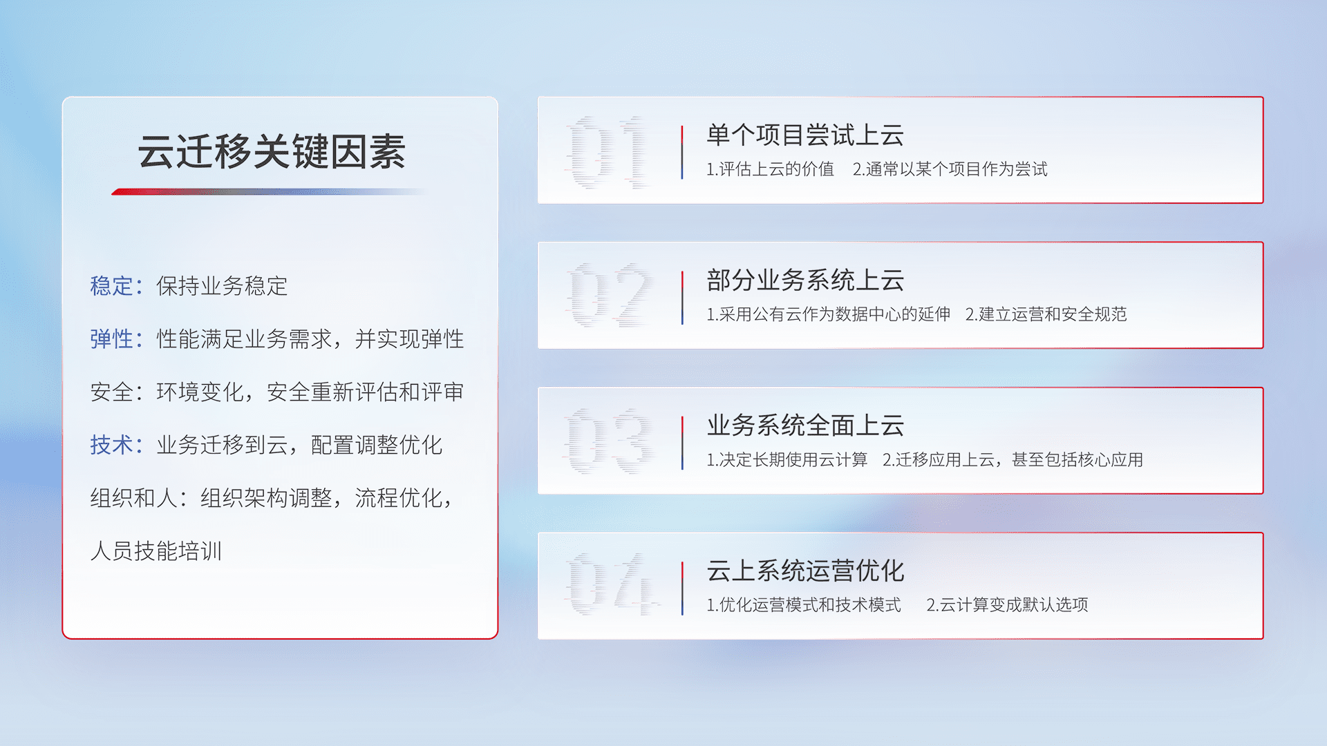 结合实际业务,,从规划设计、、云平台选型、、、、云原生改造、、、、数据迁移、、、集成交付,,迁移全过程为客户识别最佳上云路径,,,,做好风险识别管理,,,设计网络架构、、身份权限、、、、安全审计合规、、、操作审计、、日志审计、、、、监控告警策略、、、多站点容灾设计等,,对云上基础设施进行整体规划,,提升IT治理水平,,,,以满足弹性、、、、高可用、、、高性能的需求。。