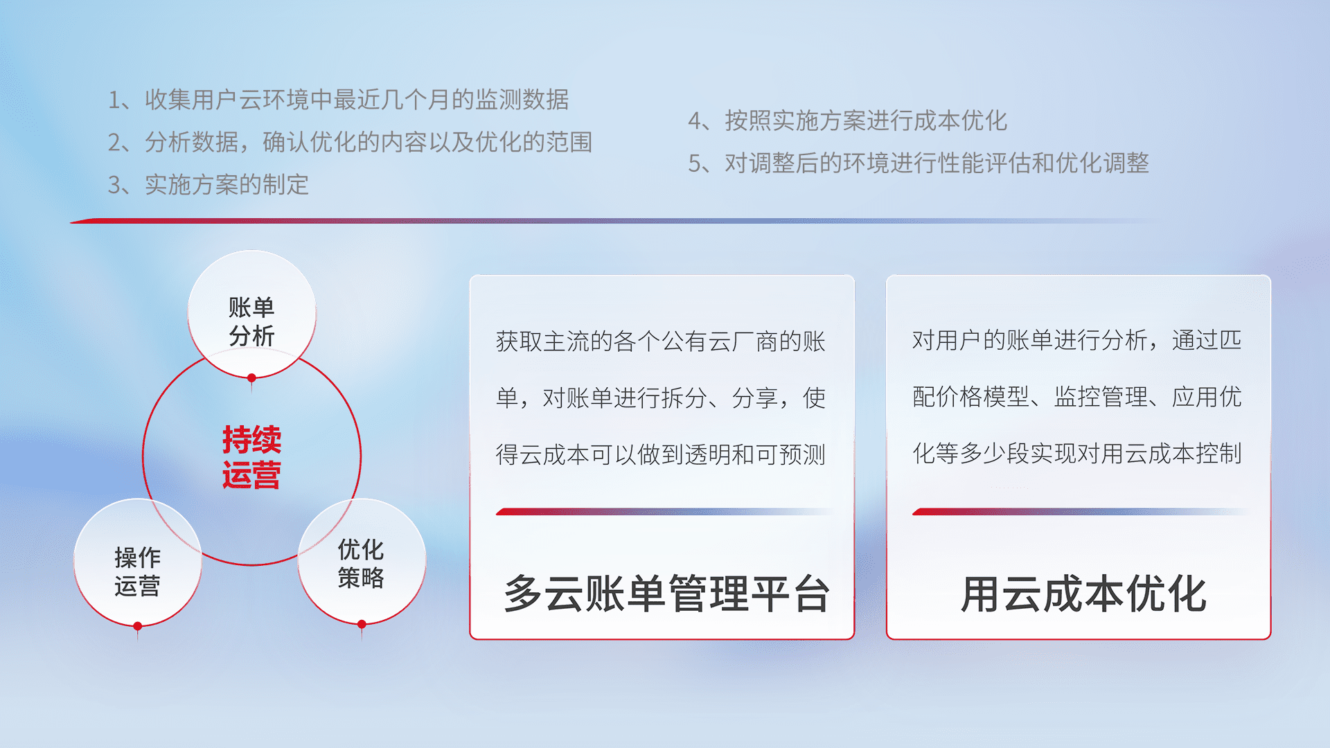 通过多云纳管,,以统一的资源数据模型把客户的云资源进行抽象和封装,,,进而实现对多云资源的统一操作,,,,保障云资源管理的可靠性、、、稳定性与可用性。。量身定制化运维内容,,,配置、、、、开发运维、、、补丁管理、、、备份、、、监控、、认证和访问管理、、、审计和日常巡检等,,,保障在用云过程中的可靠度,,,,稳定度以及高可用率。。